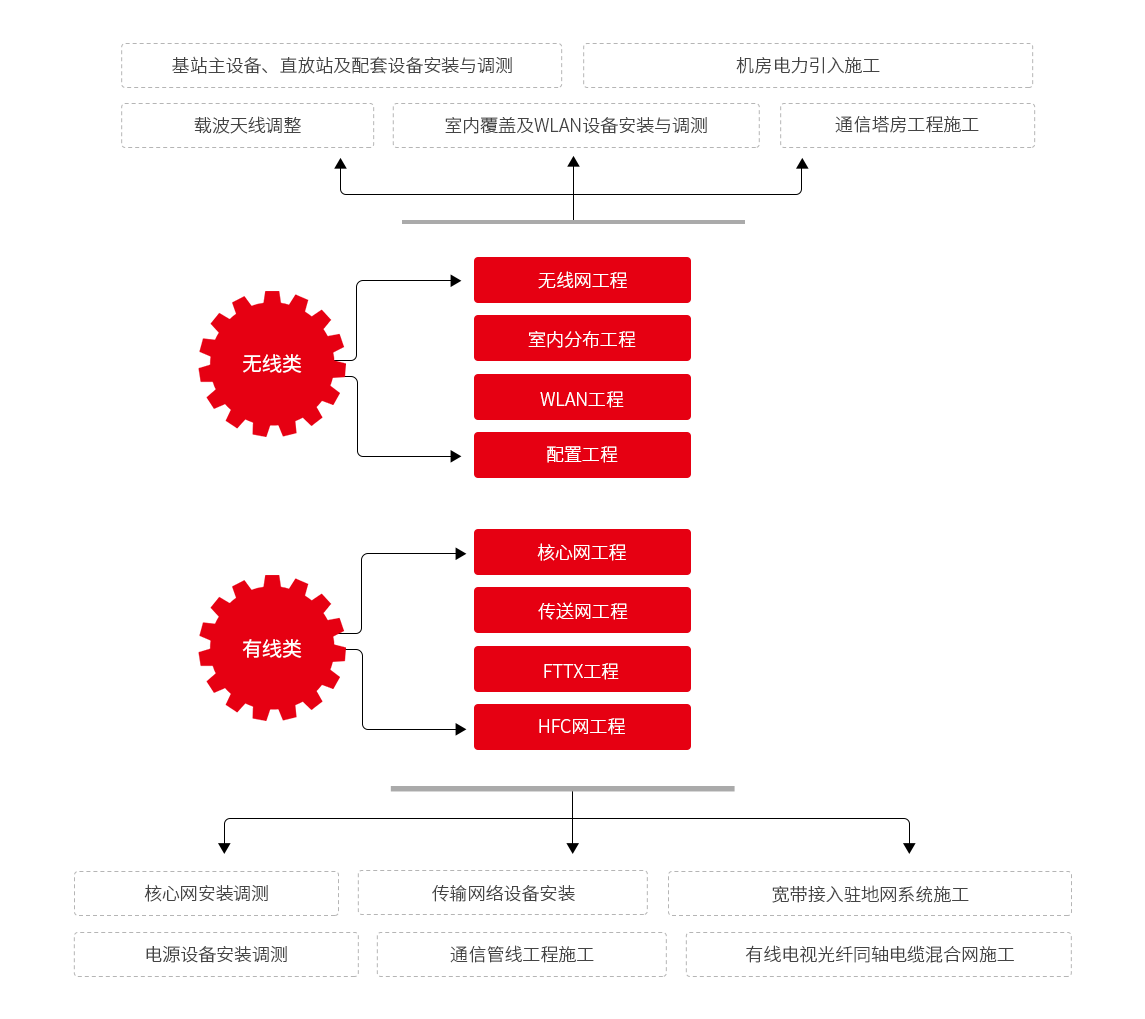 能夠提供通信建設的全專業(yè)服務,業(yè)務范圍包括核心網工程、傳送網工程、FTTX工程、HFC網工程、無線網工程、室內分布及WLAN工程等專業(yè)。施工內容包含核心網設備安裝調測、電源設備安裝調測、傳輸網絡設備安裝調測、基站主設備安裝調試、直放站及配套設備安裝調測、室內覆蓋及WLAN設備的安裝調測、寬帶接入駐地網、系統(tǒng)集成施工、有線電視光纖同軸電纜混合同施工、通信管線工程施工、載波及天線調整等;為客戶提供多元化施工解決方案,以及優(yōu)質的全方位服務。
